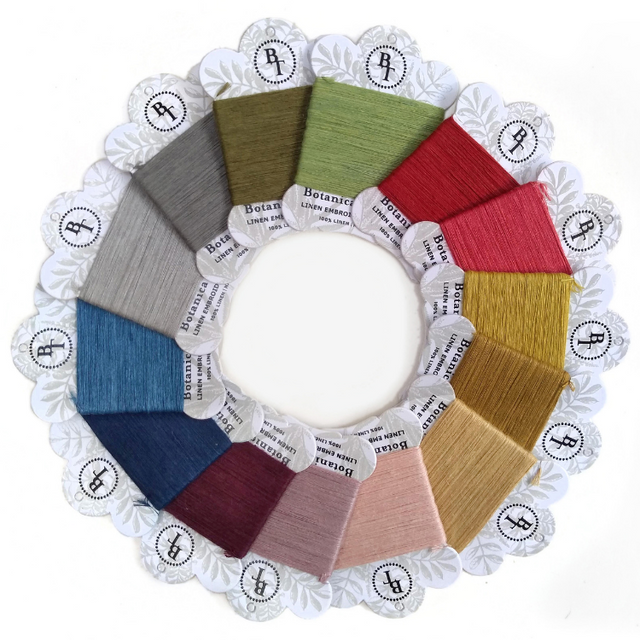 6-Strand Linen, 10m. per card. Individual thread size is Lea 50/1 Linen. Offered in 14 naturally dyed colors.